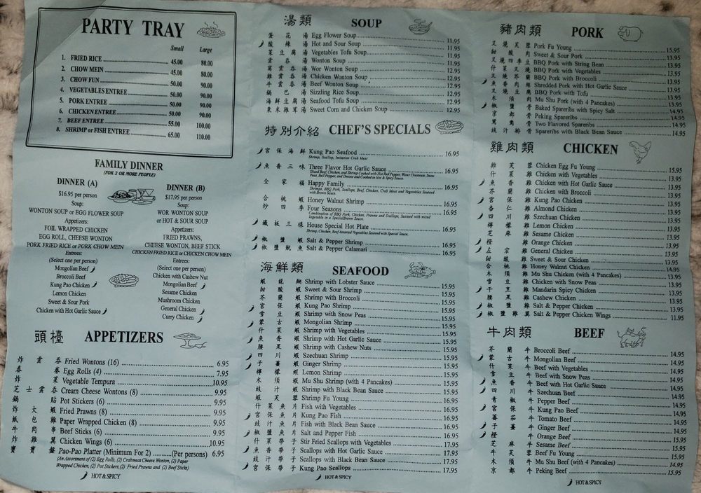 Sliced beef chicken, and shrimp, water chestnuts, snow peas, bell pepper, and onions and cooked in hot and spicy sauce. Hot and spicy.