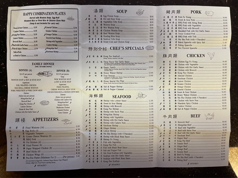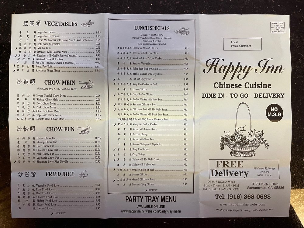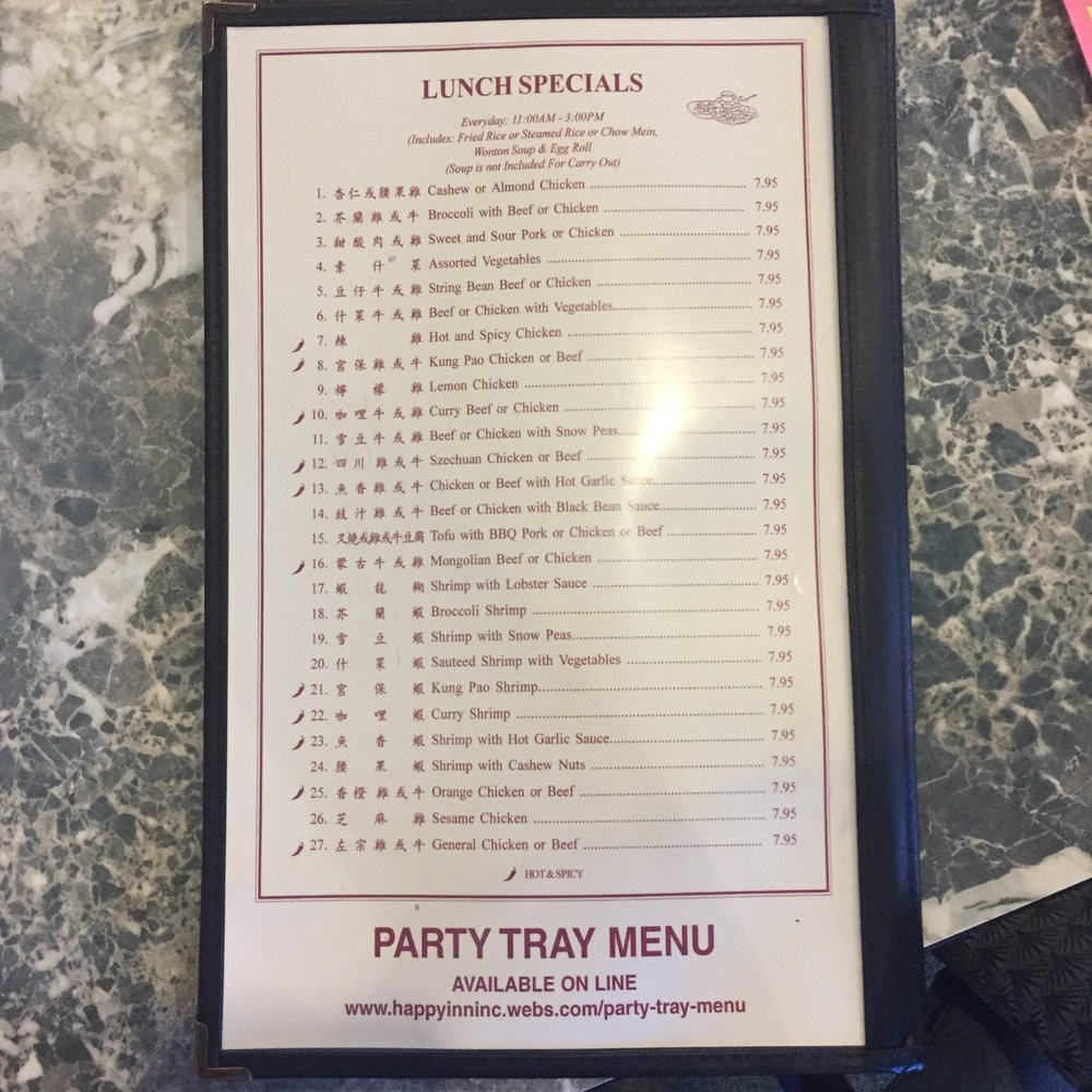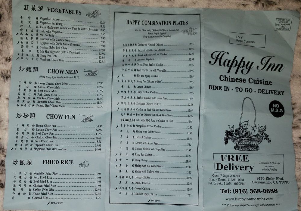 "Happy Inn, located in Sacramento, CA, offers a variety of dishes with many vegetarian options. The restaurant provides excellent customer service and spacious seating, creating a comfortable dining experience. The menu features flavorful combination plates like Broccoli Beef, Curry Chicken, and General Chicken, all priced reasonably at $16.95. Appetizers like Fried Wontons and Egg Rolls are perfect starters, while the Egg Flower Soup and Hot and Sour Soup are satisfying choices for soup lovers. Customers rave about the generous portions and fast service, with favorites like the Mongolian Beef Combo and Orange Chicken receiving high praise. Whether dining in or ordering takeout, Happy Inn guarantees a delicious meal that will leave you satisfied and wanting more."